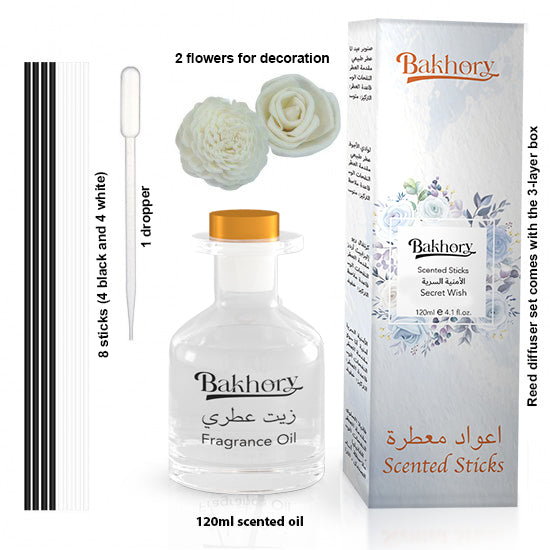 مجموعة موزع الروائح العطرية الخاصة بنا تأتي مع صندوق مكون من 3 طبقات يحتوي على ما يلي: زيت معطر 120 مل، 8 أعواد (4 أسود و4 أبيض)، 2 زهرة للزينة وقطارة واحدة.