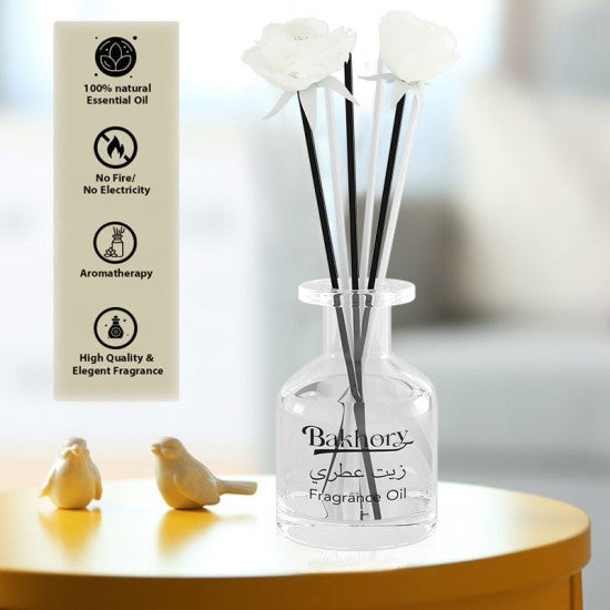 مجموعة موزع الروائح العطرية الخاصة بنا تأتي مع صندوق مكون من 3 طبقات يحتوي على ما يلي: زيت معطر 120 مل، 8 أعواد (4 أسود و4 أبيض)، 2 زهرة للزينة وقطارة واحدة.