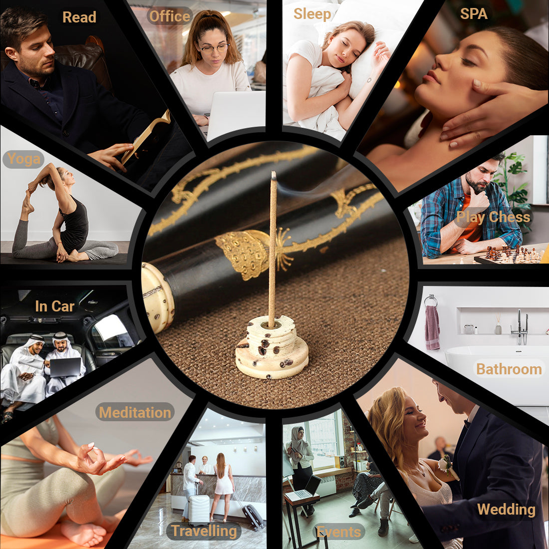تتضمن المجموعة أنبوبًا من الخيزران بتصميم جميل للتخزين وحامل بخور أنيق، مما يضمن تجربة احتراق آمنة وأنيقة. أعواد البخور هذه، المصنوعة يدويًا بالطرق التقليدية، مثالية للاستخدام اليومي والمناسبات الخاصة، أو كهدية مميزة.