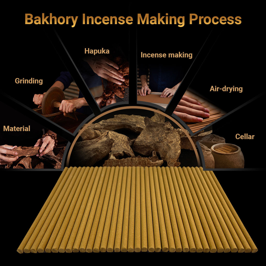 أعواد عود بخوري مصنوعة من ٨٨٪ من خشب العود و١٢٪ من مسحوق لزج طبيعي نقي، مصنوع من مياه ينابيع جبلية. ونظرًا للتغيرات الطبيعية في العالم، تتميز أعواد بخور بخوري بكثافة عالية وقيمة عالية. نستخدم أساليب إنتاج صديقة للبيئة لنقدم لكم أفضل أعواد البخور. نضمن لكم خلوها من المواد الكيميائية الضارة كالفحم والمواد المُسرّعة الأخرى.